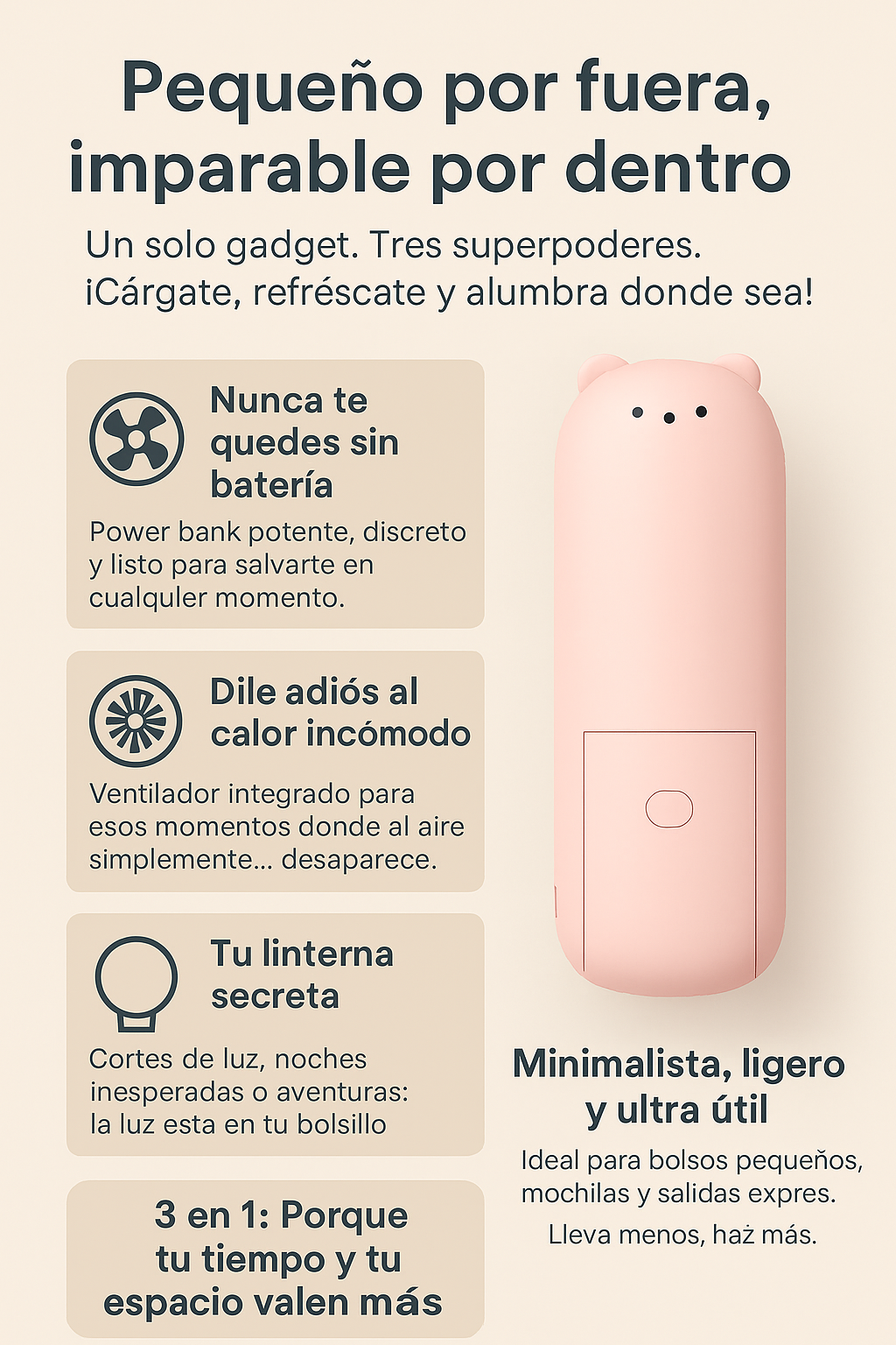 ⚡ 4 Funciones, 1 Dispositivo Power Bank + Ventilador + Linterna + Soporte de celular